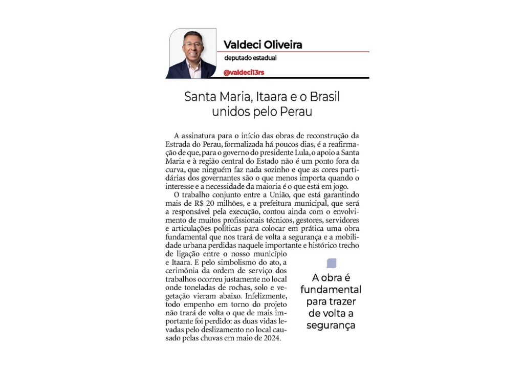 Valdeci é eleito presidente da Comissão de Ética Parlamentar da ALRS Sob a presidência de Valdeci, PT gaúcho deflagra série de caravanas regionais para construir plano de governo Artigo – Tão grave e covarde quanto o feminicídio é a negação da violência contra a mulher Mandato busca melhorias e mais agilidade na duplicação da RSC-287 Valdeci cobra protagonismo do governo gaúcho no tema das ferrovias Caçapava do Sul: Comunidade escolar se mobiliza na Assembleia por turno noturno em escola centenária RSC-287: Valdeci cobra secretário por reunião desmarcada; convocação deverá ser protocolada Relatório da Comissão Especial do Piso da Enfermagem é entregue à presidência do Coren-RS Federalização do Hospital Universitário Canoas é defendida em audiência pública RSC-287: Lideranças da Região Central cobram reagendamento de encontro com secretário estadual Precarização da saúde em Canoas será tema de audiência pública RIO GRANDE DO SUL Violência na saúde pública: marcada audiência em Santa Maria RSC-287: Valdeci cobra secretário por reunião desmarcada; convocação deverá ser protocolada RSC-287: Lideranças da Região Central cobram reagendamento de encontro com secretário estadual RSC-287: Ponte do Arroio Grande – Sacyr prevê começo efetivo de obras no final deste mês Santa Maria: Secretaria da Saúde recebe emenda de Valdeci para compra de ambulâncias e micro-ônibus Santa Maria recebe R$ 1,3 milhão em emenda de Valdeci para a saúde pública LEIA OUTRAS NOTÍCIAS PRESIDENTE DO PT RS Frente pluripartidária de apoio a Lula é lançada e une partidos do campo popular Valdeci toma posse no PT-RS e movimento pela unidade do “centro democrático” ganha força Acordo no PT-RS define Valdeci e Sofia na presidência GOVERNO LULA Fim da escala 6×1: senadores e Lula avançam rumo à jornada de 36h Desemprego tem a menor taxa da série histórica (5,8%) Inflação de outubro é a menor para o mês desde 1998 Ação coordenada acelera recuperação em áreas devastadas no PR MEC leva alimentação saudável e transporte a escolas federais Frente pluripartidária de apoio a Lula é lançada e une partidos do campo popular ARTIGOS Artigo – Tão grave e covarde quanto o feminicídio é a negação da violência contra a mulher Artigo – 46 anos da maior ferramenta coletiva de luta e de defesa do povo brasileiro Artigo – Cerco nacional aos machistas e aos feminicidas Artigo – Santa Maria, Itaara e o Brasil unidos pelo Perau Artigo – Uma conquista do tamanho de Santa Maria Artigo – O presidente Lula sabe: educação não é gasto, é investimento! LEIA MAIS ARTIGOS Siga nas Redes Sociais Facebook X-twitter Instagram