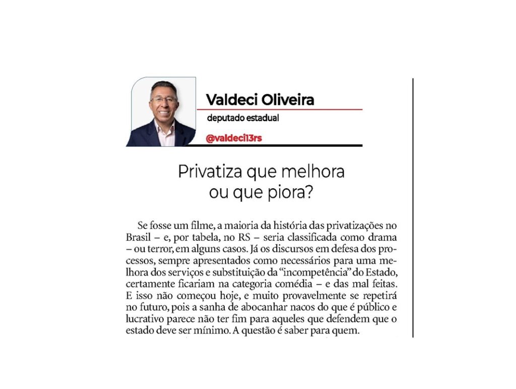 FAKE NEWS: Reportagem que mostra famílias recebendo doação de ossos é de 2021, não atual 5 RAZÕES PARA LULA E O PT DEFENDEREM O FIM DA ESCALA 6×1 Artigo – Eu apoio o fim da escala 6×1 no Brasil Pergunta segue: quando vai começar a duplicação? 150 anos de Rosário do Sul: Valdeci presta homenagem com Grande Expediente na Assembleia Legislativa Extensão Rural: Valdeci presta homenagem pelos 50 anos do Programa da UFSM Violência na saúde pública: marcada audiência em Santa Maria Indicado por Valdeci, Pedro Ortaça receberá Prêmio Teixeirinha da Assembleia Legislativa Frente pluripartidária de apoio a Lula é lançada e une partidos do campo popular Caçapava do Sul: Comunidade escolar se mobiliza na Assembleia por turno noturno em escola centenária RSC-287: Valdeci cobra secretário por reunião desmarcada; convocação deverá ser protocolada RIO GRANDE DO SUL Violência na saúde pública: marcada audiência em Santa Maria RSC-287: Valdeci cobra secretário por reunião desmarcada; convocação deverá ser protocolada RSC-287: Lideranças da Região Central cobram reagendamento de encontro com secretário estadual RSC-287: Ponte do Arroio Grande – Sacyr prevê começo efetivo de obras no final deste mês Santa Maria: Secretaria da Saúde recebe emenda de Valdeci para compra de ambulâncias e micro-ônibus Santa Maria recebe R$ 1,3 milhão em emenda de Valdeci para a saúde pública LEIA OUTRAS NOTÍCIAS PRESIDENTE DO PT RS Frente pluripartidária de apoio a Lula é lançada e une partidos do campo popular Valdeci toma posse no PT-RS e movimento pela unidade do “centro democrático” ganha força Acordo no PT-RS define Valdeci e Sofia na presidência GOVERNO LULA ÓDIO A MULHERES É CRIME, NÃO É OPINIÃO; PETISTAS CELEBRAM PROJETO APROVADO Fim da escala 6×1: senadores e Lula avançam rumo à jornada de 36h Desemprego tem a menor taxa da série histórica (5,8%) Inflação de outubro é a menor para o mês desde 1998 Ação coordenada acelera recuperação em áreas devastadas no PR MEC leva alimentação saudável e transporte a escolas federais ARTIGOS Artigo – Eu apoio o fim da escala 6×1 no Brasil Pergunta segue: quando vai começar a duplicação? Unir forças para barrar uma “usina de retrocessos” Artigo – Os “amigos do rei” ganharam forte companhia Artigo – A indigência assombra 30 mil servidores do Rio Grande Artigo – Privatiza que melhora ou que piora? LEIA MAIS ARTIGOS Siga nas Redes Sociais Facebook X-twitter Instagram