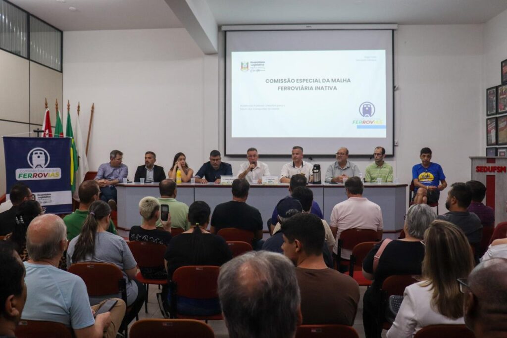 Santa Maria sediou, na noite de quinta-feira (19/1), a primeira das nove audiências públicas programadas para acontecer em diferentes regiões do RS e que irão analisar as ferrovias inativas no território gaúcho e a participação do estado no novo plano de concessões da União para o setor ferroviário. O encontro reuniu vereadores de diferentes partidos e representantes da UFSM, da Defensoria Pública, das famílias que residem à margem da malha ferroviária (os chamados Beira-Trilhos), Fecomércio. Sindilojas, Prefeitura Municipal, Corede, SINDIFERGS (Sindicato dos Ferroviários do RS), Unipampa e CUT, além de ex-funcionários da antiga RFFSA e lideranças de movimentos sociais.