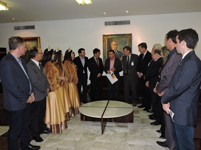 Representando o presidente da Assembleia Legislativa, os deputados estaduais Valdeci Oliveira (PT), Jeferson Fernandes (PT) e Eduardo Loureiro (PDT) recepcionaram a comitiva de São Luiz Gonzaga que veio a Porto Alegre divulgar a Expo 2017. Liderados pelo prefeito Sidney Brondani, pelo presidente do evento, Nilton Luiz Teixeira, e pelas rainhas e princesas, o grupo apresentou, na quarta (13), a programação e as principais atrações da exposição, que acontecerá do dia 27 de setembro até 1º de outubro, no Parque de Exposições do Sindicato Rural.