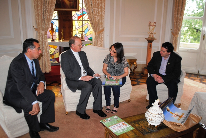 O bispo da Arquidiocese de Santa Maria, Dom Hélio Adelar Rubert, esteve no Palácio Piratini e no Palácio Farroupilha, sede da Assembleia Legislativa, em Porto Alegre, nesta quinta (30), para divulgar a 71ª Romaria Estadual de Nossa Senhora Medianeira. Acompanhado do deputado estadual Valdeci Oliveira (PT) e do padre Sílvio Weber, Rubert fez a entrega do convite da Romaria, que acontece no próximo dia 9 de novembro, aos dois chefes de poderes: o governador Tarso Genro e o deputado Gilmar Sossella, que preside o Parlamento Gaúcho. No Palácio Piratini, o convite do governador foi recebido pela Secretária da Assessoria Superior do governador, Mari Perusso, e, na Assembleia Legislativa, pelo chefe de gabinete da presidência, Jair Luis Muller. “Contamos com a presença das nossas autoridades para realizarmos, mais uma vez, em Santa Maria, uma grande demonstração de fé e de devoção à Mãe Medianeira”, destacou Dom Hélio.