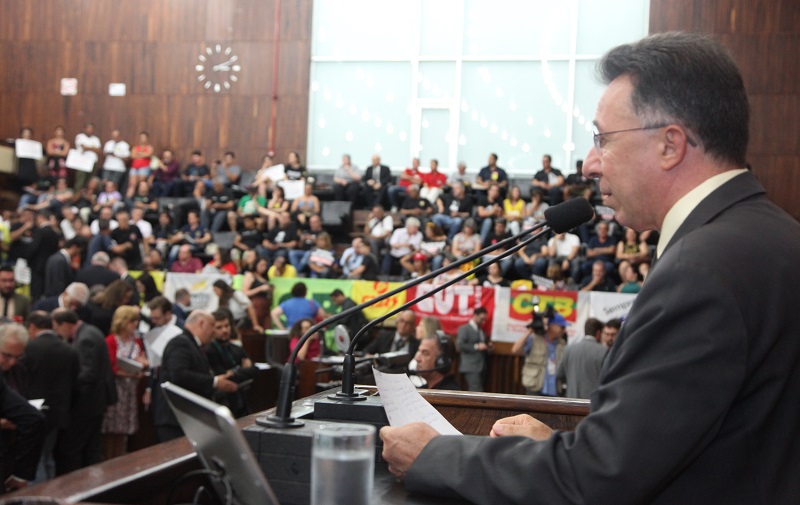 O deputado estadual Valdeci Oliveira ocupou a tribuna da Assembleia Legislativa, nesta terça-feira (28/12), para se manifestar a respeito do Projeto de Lei Complementar (PLC) 285/2019, que altera e precariza as carreiras dos servidores públicos gaúchos. O PLC 285 foi o primeiro dos nove projetos que integram o pacote do Executivo a ser analisado pelos deputados estaduais durante a convocação extraordinária realizada nesta última semana de janeiro. “O governo, na verdade, está esfaqueando os servidores desse estado, está esfaqueando aqueles que, dia após dia, defendem a sociedade, seja na segurança, na saúde, na educação e em outros setores essenciais. Os servidores desse estado não deixam de cumprir suas obrigações mesmo estando com salário parcelado e congelado há muito tempo”, disparou Valdeci.