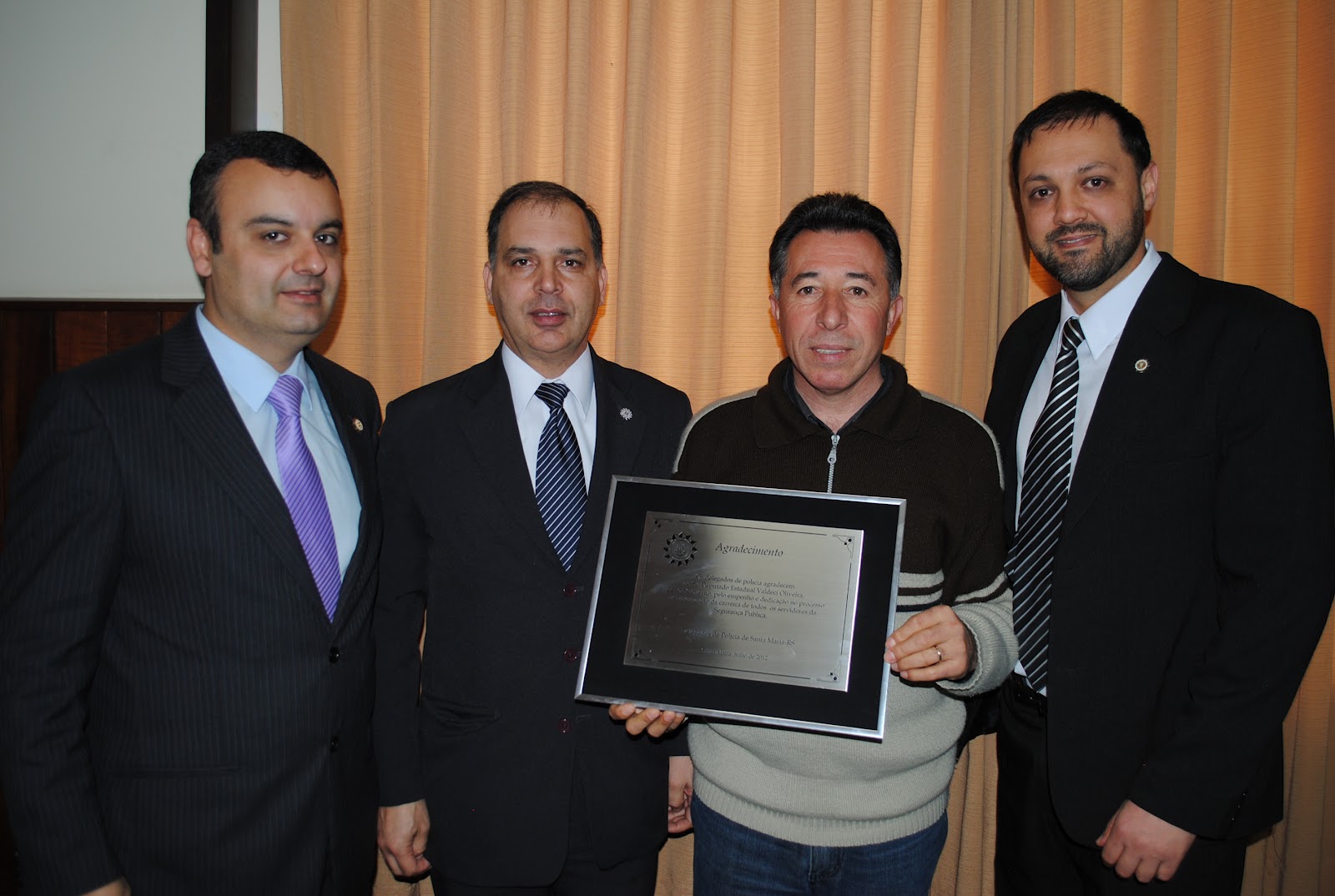 Nesta terça-feira (24), o líder do governo na Assembleia, deputado estadual Valdeci Oliveira (PT) recebeu uma homenagem dos delegados da Polícia Civil de Santa Maria. A distinção foi em reconhecimento ao trabalho realizado pela liderança em prol da valorização dos servidores da segurança pública. Durante todo o primeiro de 2012, Valdeci e os servidores desenvolveram um trabalho focado no diálogo com o governo do Estado que culminou na confirmação do maior reajutes da história para a categoria, com aumentos entre 63,79% e 171,65%.