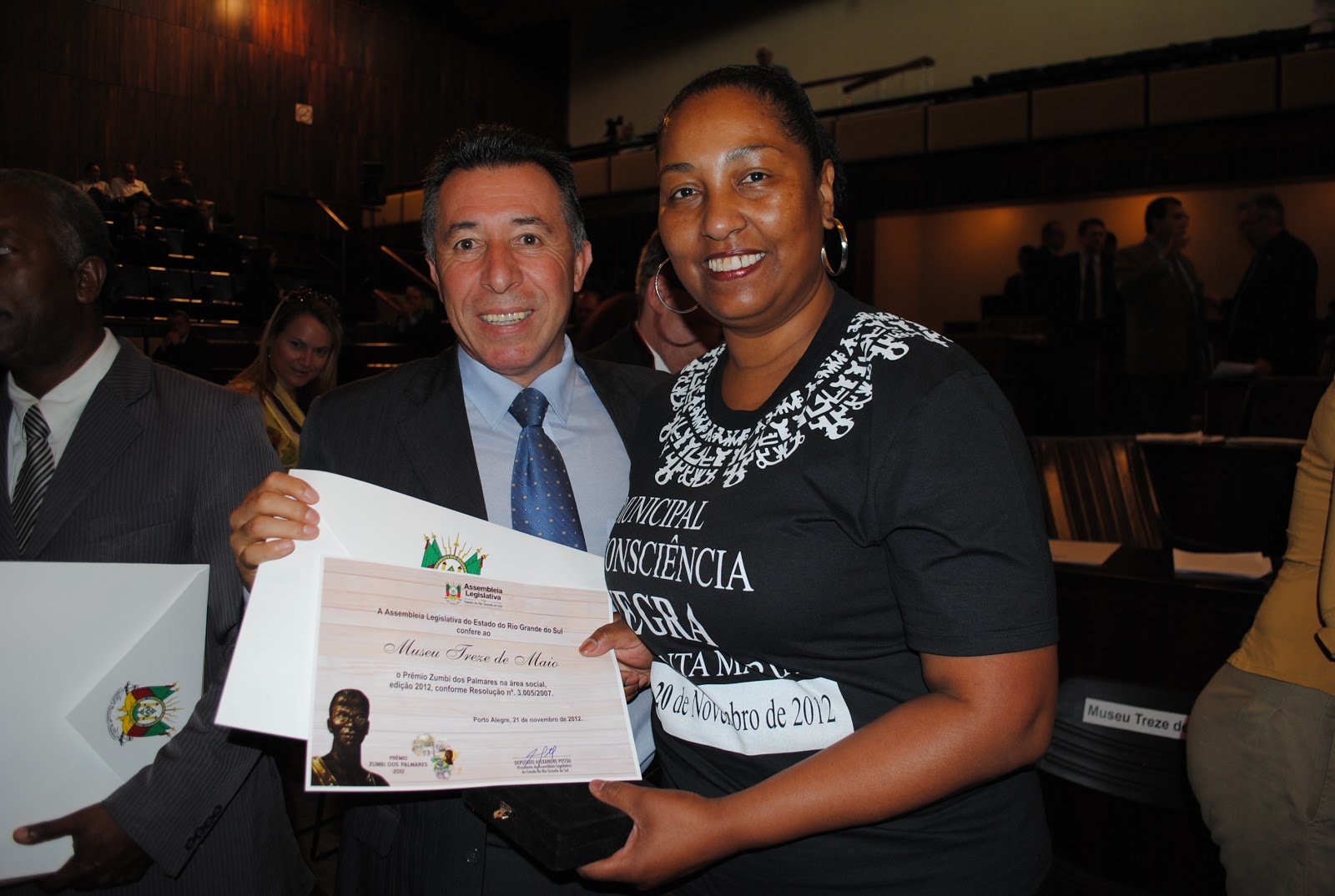 Símbolo da história do movimento negro em Santa Maria, o Museu 13 de Maio foi condecorado, na tarde desta terça (21), com a Medalha Zumbi dos Palmares da Assembleia Legislativa do Rio Grande do Sul. A medalha, criada em 2007, homenageia entidades e personalidades atuantes nas áreas cultural, social, política, esportiva e religiosa. O prêmio concedido ao Museu pela Assembleia, na categoria social, uma das cinco existentes, foi recebido pela diretora do Museu, Giane Vargas Escobar.