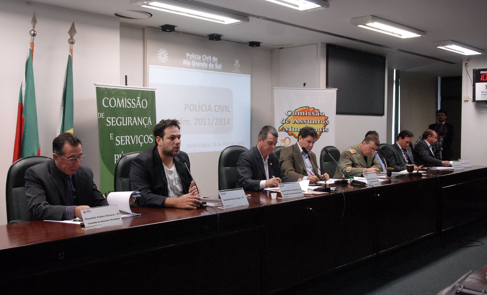 Atendendo convite do Parlamento Gaúcho, o comandante da Brigada Militar, Coronel Fábio Duarte, e o chefe da Polícia Civil no Estado, Delegado Ranolfo Vieira Júnior, participaram, nesta terça (16), de uma audiência pública conjunta das comissões de Assuntos Municipais e de Segurança e Serviços Públicos da Assembleia Legislativa. Acompanhados do líder do governo no Legislativo, o deputado Valdeci Oliveira (PT), os dois representantes do comando da Segurança Pública gaúcha apresentaram as principais ações e projetos desenvolvidos no Estado. Primeiro a se pronunciar, o delegado Ranolfo Vieira Júnior ressaltou que, nos últimos dois anos, os policiais civis foram contemplados com a aprovação da aposentadoria especial e do subsídio, reivindicações de muitos anos da categoria. No período, 3.178 servidores, o que corresponde a 60% do efetivo, foram promovidos. No ano passado, 732 inspetores e escrivães foram nomeados e a corporação recebeu um helicóptero do governo do Estado.
