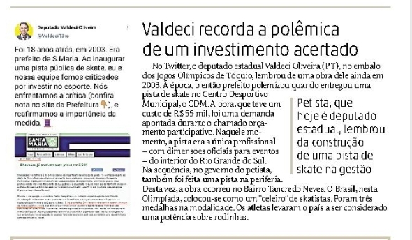 Com as Olimpíadas de Tóquio e as medalhas brasileiras na modalidade do skate, o apoio e a ação concreta de Valdeci à prática desse esporte em Santa Maria quando prefeito, há 18 anos, foram destaque no jornal Diário de Santa Maria desta sexta-feira (6). “Na época fomos criticados por investir no esporte. Enfrentamos as críticas e reafirmamos a importância da medida”, avaliou o parlamentar em postagens em sua conta no Twitter.