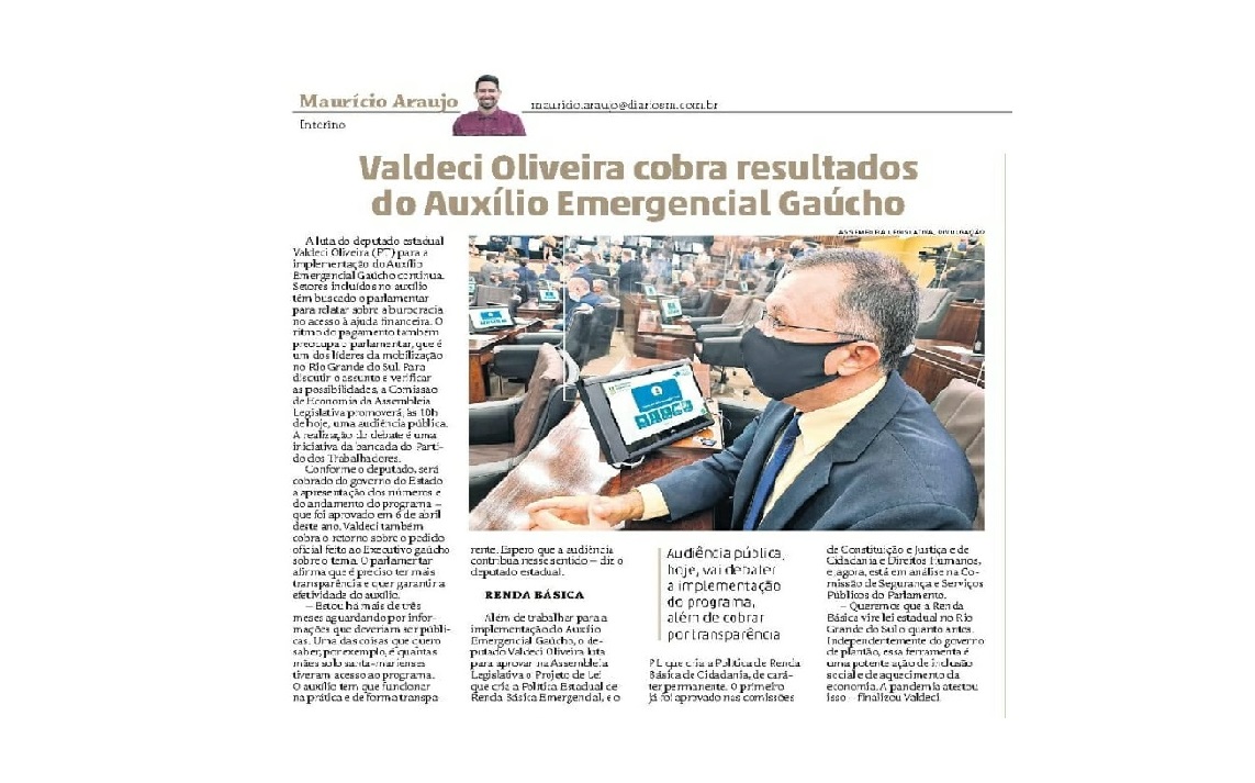 O trabalho realizado pelo mandato em defesa – e implementação – do Auxílio Emergencial Gaúcho ganhou destaque na edição de 23 de agosto do jornal Diário de Santa Maria.