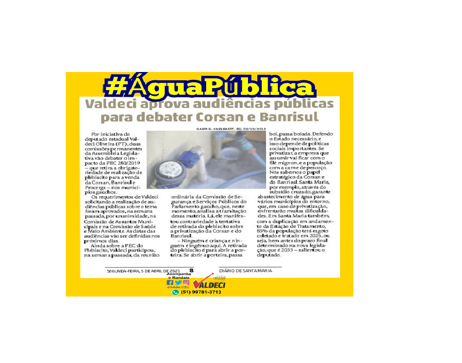NO DIÁRIO DE SANTA MARIA DESTA SEGUNDA-FEIRA (5/4): SEGUIMOS MOBILIZADOS PELA ÁGUA PÚBLICA.