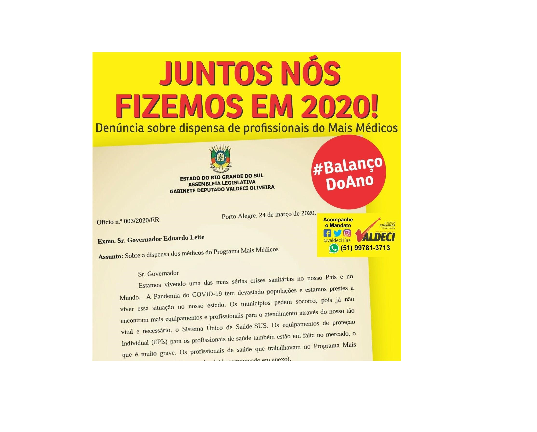 O desligamento dos contratos de profissionais do Programa Mais Médicos em plena pandemia foi denunciada pelo nosso mandato na Assembleia Legislativa neste ano de 2020.