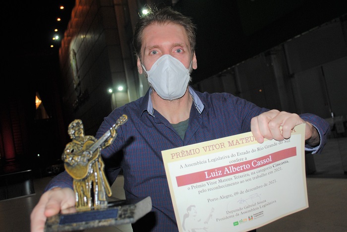 O diretor, produtor e roteirista cinematográfico Luiz Alberto Cassol, que é natural de Santa Maria, recebeu, na noite desta quinta-feira (9/12), no Teatro Dante Barone, em Porto Alegre, o Prêmio Vitor Mateus Teixeira 2021 na Categoria Cineasta. Ele foi um dos 19 agraciados (ver os demais premiados na lista abaixo) com a honraria, que foi criada pela Assembleia Legislativa em 1997. Ao receber o Troféu, ele lembrou da trajetória do Festival Santa Maria Vídeo Cinema. “Agradeço essa premiação à Assembleia Legislativa, ao júri e ao deputado Valdeci Oliveira, que fez essa indicação. Não à toa, o Valdeci, em 2001, no seu primeiro mandato como prefeito (de Santa Maria), realizou um sonho que eu tinha, junto com um grupo de pessoas da cidade, que foi realizar o Santa Maria Vídeo e Cinema, festival que, no ano que vem, completa 20 anos”, assinalou ele.