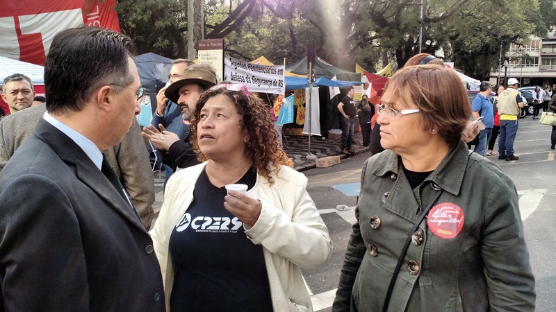 O deputado estadual Valdeci Oliveira (PT) acompanhou toda a mobilização dos servidores públicos estaduais nesta terça (15), em Porto Alegre, contra uma série de projetos encaminhados pelo governador Sartori ao Parlamento gaúcho. Unidas, as categorias de trabalhadores barraram o acesso à Assembleia Legislativa desde as primeiras horas da manhã como forma de pressionar o Executivo a dialogar sobre a retirada de matérias da pauta. Entre as propostas polêmicas, estavam a extinção da Fundação Estadual de Pesquisa em Saúde (FEPPS) e da Fundação Estadual de Esporte e Lazer (Fundergs) e a criação de um modelo de previdência complementar dos servidores. “Os servidores lançaram mão, de forma ordeira e respeitosa, da única alternativa possível para fazer o Executivo retomar o diálogo. Em nenhum um momento, o governador ouviu os servidores e os apelos feitos pelas bancadas de oposição.  Ele queria, simplesmente, passar a patrola na votação em plenário. A resposta foi dada neste dia histórico para a política gaúcha”, afirmou Valdeci.