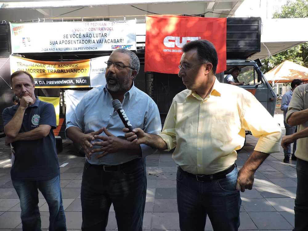 Ao lado do senador Paulo Paim (PT), o deputado Valdeci Oliveira participou do ato público contra as reformas trabalhista e da Previdência, que foi promovido na Praça Saldanha Marinho, no centro de Santa Maria, nessa quinta (13), pelas centrais sindicais da cidade e da região. Autor do requerimento de criação de uma Comissão Parlamentar de Inquérito (CPI) que pretende investir a real situação da Previdência nacional, Paim bateu na tecla que a o sistema de aposentadoria do país arrecada mais do que gasta. “Nos últimos 20 anos, em média, os recursos da Previdência foram superavitários em mais de R$ 50 bilhões”, declarou ele.