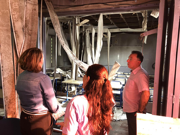 Nesta quinta-feira (13), o deputado estadual Valdeci Oliveira foi até a Escola Estadual Marieta D´Ambrósio, em Santa Maria, para verificar pessoalmente os danos causados à instituição após o incêndio ocorrido no último sábado (8). Ao lado da diretora Adriane Guerra, da vice-diretora e de professores, Valdeci vistoriou a estrutura da escola, principalmente as seis salas que foram interditadas pelo Corpo de Bombeiros. O deputado já solicitou uma audiência com o secretário estadual da Educação, Faisal Karam, para tratar dos reparos necessários. “Pretendo conversar com o secretário na semana que vem. Sabemos que, se não forem feitas cobranças diretas e efetivas, a tendência é que as obras de conserto da estrutura demorem muito tempo a acontecer. A própria escola já havia solicitado a realização da troca do sistema elétrico e esse serviço ainda não foi feito. O incêndio chegou antes. Felizmente só ocorreram danos materiais, mas não se pode contar com a sorte sempre”, ressaltou Valdeci.
