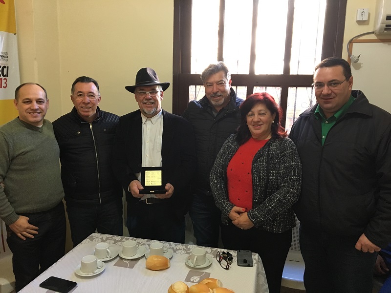 A entrega da comenda ocorreu durante um café da manhã de confraternização no escritório regional do mandato do Valdeci, em Santa Maria, e contou com a presença da vereadora Celita da Silva , dos vereadores Daniel Diniz, Luciano Guerra e Valdir Oliveira, da presidente municipal do PT, Helen Cabral, e do coordenador regional do partido, Paulo Conceição.