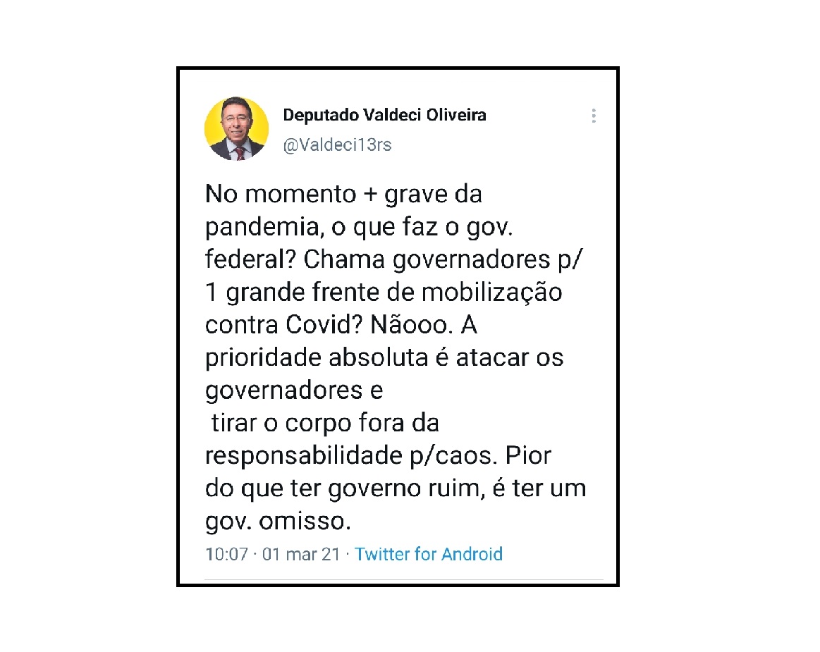 Para o deputado Valdeci, o presidente Jair Bolsonaro precisa entender que a luta deve ser travada contra o vírus e a favor da vacinação da população. “Por favor, presidente, desça do palanque, coloque uma máscara e convoque uma frente de mobilização nacional contra a Covid”, afirmou Valdeci, lembrando que Bolsonaro precisa assumir o papel de líder da nação. “O presidente da República jamais pode se omitir de salvar vidas”, sentenciou.