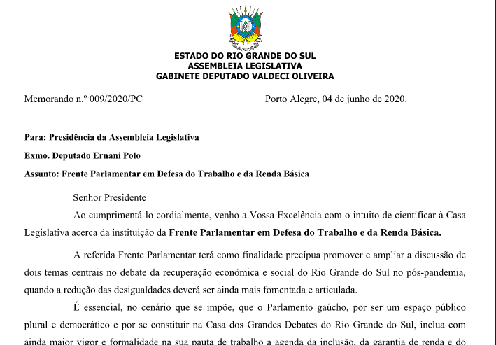 A iniciativa dele, inclusive, vai inaugurar, no Parlamento gaúcho, a formalização virtual de frentes parlamentares. “Nós entendemos que o debate da Renda Básica não se encerra com a superação da crise da Covid-19. Pelo contrário, a nossa posição é que essa política tem de ser permanente e não apenas um ´tapa-buracos´ em momentos emergenciais. A criação da Frente vai fortalecer a discussão sobre essa pauta e sobre as questões do trabalho e da geração de emprego e renda, as quais serão ainda mais centrais no pós-pandemia. Espero contar com o aval e a participação de diferentes bancadas”, destacou Valdeci.